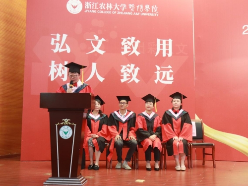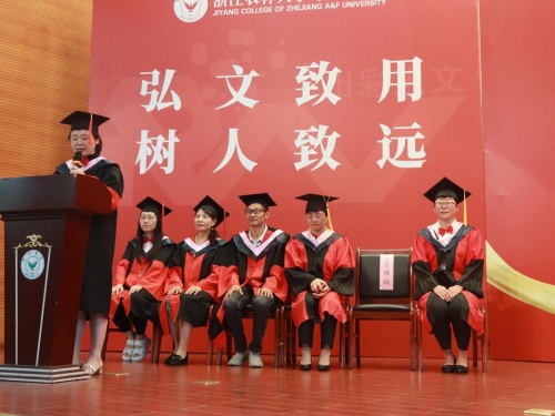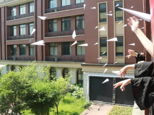 典礼开始前,人文学院特别举行“放飞梦想”仪式,全体毕业生在工作人员的引导下,拿着代表希望与未来的纸飞机,依次穿过由毕业生与广告公司共同设计写满毕业语录的文案墙,文案墙摆放错落如曲折的人生道路,配色明亮如青春的无限光彩,最终到达人文楼2号楼长廊,伴随着必赢766net手机版党委书记潘国忠的口令,教师代表与毕业生共同放飞“青春梦想”的纸飞机。纸飞机滑向天际,《你曾是少年》的歌声响起,同学们挥舞红旗放声歌唱。随后,毕业生代表献唱《浙江农林大学校歌》,抒发了对学校的热爱、对美好未来的向往和祝愿。
