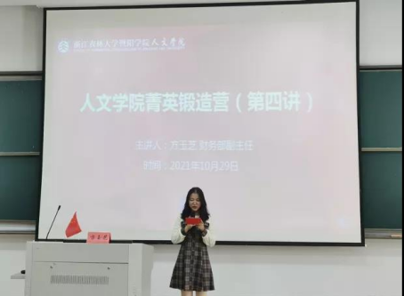 为了服务师生,帮助师生了解国家和学院财经政策,更好的做好财务报销和财务管理工作,结合“学史明理、学史增信、学史崇德、学史力行”主题教育精神,进一步提升人文学院学生干部的综合素质、文化涵养以及政治理论教育作用,10月29日下午2点,人文学院于人文4310举办了“菁英锻造营”第四讲。此次讲座由必赢766net手机版财务部副主任方玉芝主讲,人文学院、马克思主义学院党总支书记宣王威,人文学院党总支副书记,人文学院各系部主任、专业负责人、辅导员、学生干部代表等参加本次讲座。