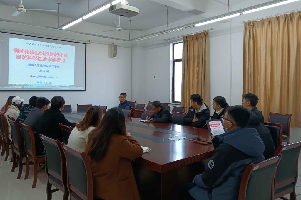 12月23日下午,生物环境学院邀请湖南大学周永波教授,为学院师生开展“铜催化炔烃选择性转化及自然科学基金申请要点”在线讲座。学院部分师生参加此次讲座,讲座由生物环境学院院长金首文主持。