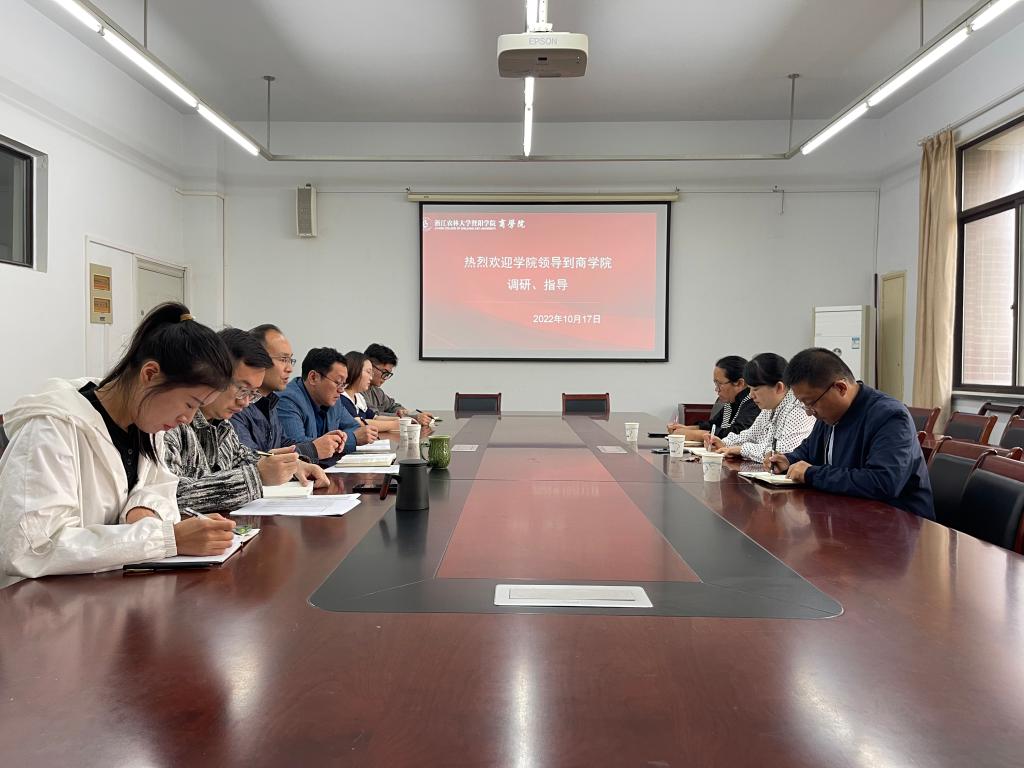 10月17日下午,党委书记洪昀、党委副书记高国俊在学工部主任徐春霞陪同下到商学院调研、指导毕业生就业工作,并围绕就业现状和推进举措展开座谈。商学院班子成员何红光、张佩成、屠蒋威及2022届、2023届辅导员参加座谈交流。