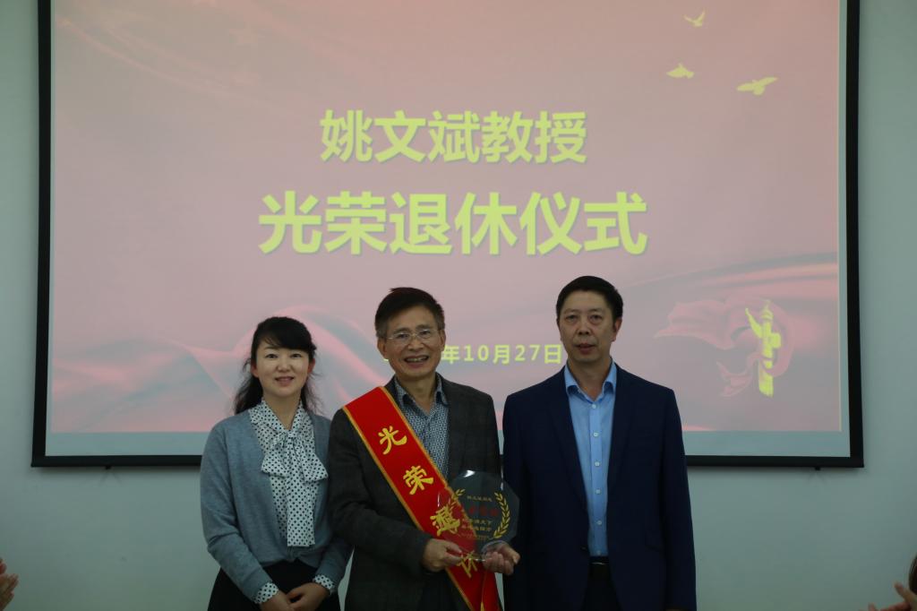 在荣休仪式上,徐光辉充分肯定了姚文斌教授多年来在学院教学、科研、学科建设工作中的辛勤付出,感谢他为学院发展做出的重要贡献,并衷心祝福姚文斌教授身体健康,希望他退而不休,常回家看看,继续支持和关心学院的发展。徐光辉表示,荣休仪式表达一种理念,即给予奉献了一辈子的教师最大的尊重,给予我们共同的教育事业最大的尊重,给予我们每个人都会面对的退休生活最大的尊重,希望大家重视并做好教职工退休相关服务工作。同时,他号召教职工继承和发扬前辈的优良作风,在工作中展现出应有的责任担当,为学院的发展贡献力量。