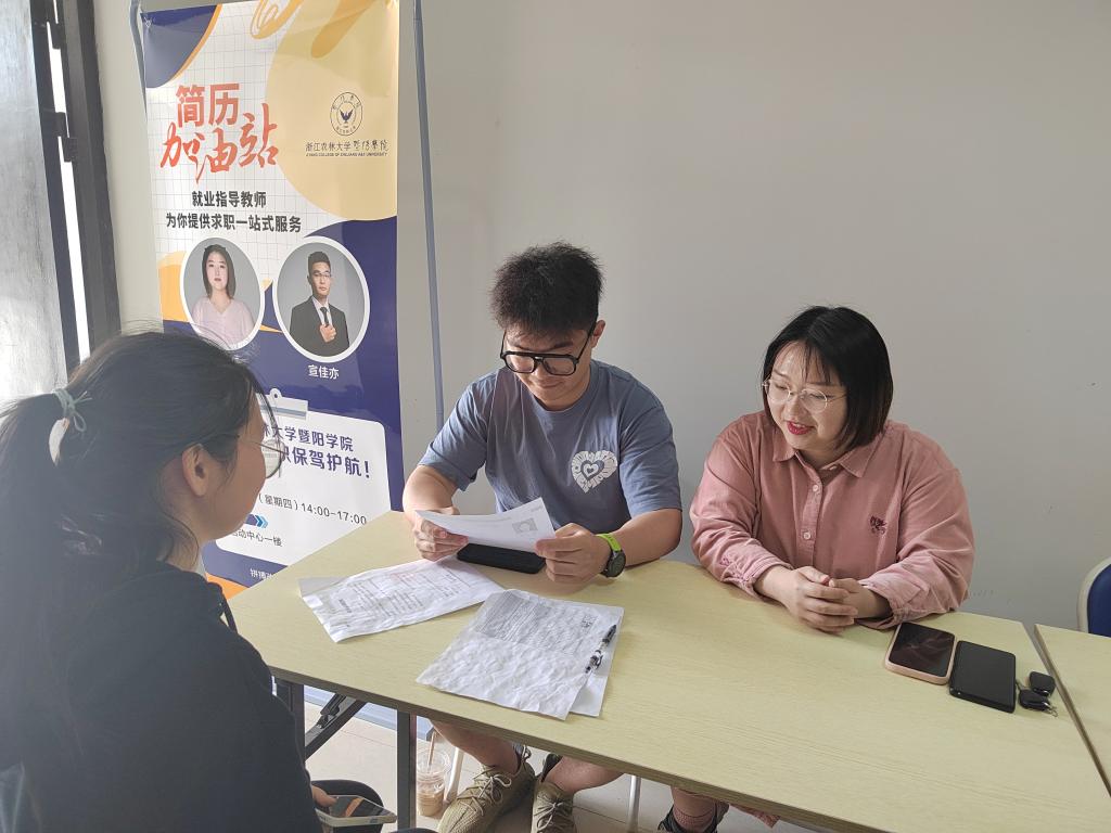 在4月毕业生求职的黄金时期,学工部联合诸暨市人社局于4月13日、4月20日、4月27日下午在学院活动中心一楼组织了三场现场招聘会,有40余家企业到场,主要包含机械制造、中智能装备制造、环保新能源、铜加工及新型材料、纺织服装、袜业、珍珠业等六大传统主导企业和其他新兴产业,精准对接诸暨市企业用人需求,引导学生“留诸”就业。招聘会现场,学院就业指导课教师开设“简历加油站”,为学生提供现场简历制作指导,针对不同专业、不同求职目标进行个性化定制,提供精准的求职建议。
