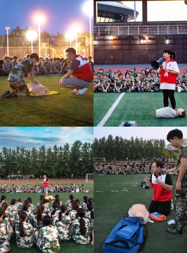 同学们以每个连队为单位展开培训,四位讲师分别对四个连队讲述了高温下常见的突发情况及心肺复苏、AED的操作流程和要点等基础急救知识,并对同学们不规范的操作进行了指导、纠正。