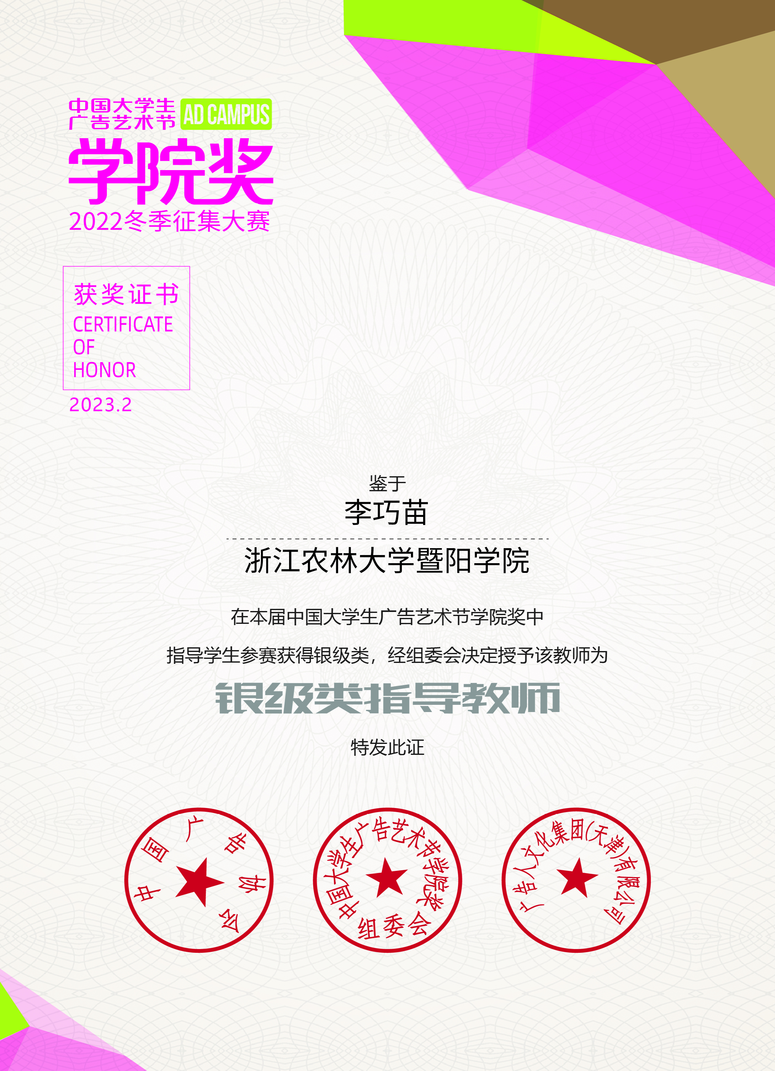 经过激烈角逐,必赢官网广告学专业学生在本次大赛中获得国家级银奖1项,优秀奖3项,入围奖4项。其中由2021级广告学专业学生来丹棋、陈星竹、陈佳禾、俞昱辰、孙嘉然、傅静雯共同创作,教师李巧苗指导的作品《45°青年拯救计划》荣获“松能”营销策划类命题全国银奖。同时,李巧苗荣获“银级类杰出指导教师”称号。