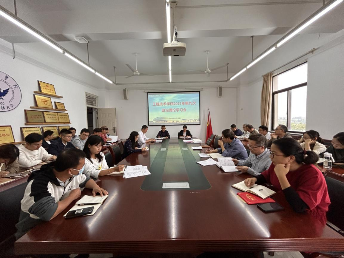 10月19日下午,工程技术学院在理工3402会议室召开2023年第九次政治理论学习会,会议由工程技术学院党总支书记周聪主持,院长彭樟林、副院长胡建华出席会议,全体教职工参加会议。