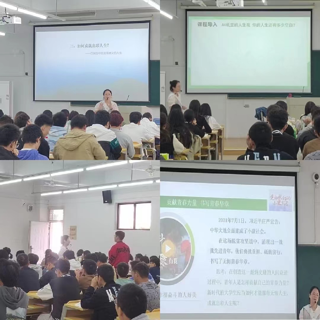 本次教学示范课授课主题是“如何成就出彩人生?——在实践中创造有意义的人生”。在课程导入阶段,孟琳琦用A4纸空白格引导学生们形象地感受已流逝的时光,引发学生们思考接下来的美好青春将如何来度过。在引用李大钊先生的《青春》让学生们讨论青春的含义后,孟琳琦肯定大家对青春的理解,并通过视频让同学们了解我国打赢脱贫攻坚战,全面建成小康社会的背后所涌现出来的一批青年人,他们贡献青春来为打赢脱贫攻坚战奉献自己的力量。孟琳琦依次从“与历史同向”“与祖国同行”“与人民同在”三个维度展开讲解,层层递进,分别利用“抗战时期,进步青年奔赴延安”“亚运会志愿者‘小青荷’”以及“习近平总书记给中国农业大学科技小院同学们的回信”阐述每一部分内容,让学生们懂得青年人只有把自己的人生目标与国家民族的前途命运紧密相连,才能更好地实现人生价值。在课程的最后,孟琳琦倡导大家积极参与社会实践,走到第一线,从基础干起,把自己的所学融入到为国家、为人民群众服务当中,在实现人民群众利益中实现自身的价值。