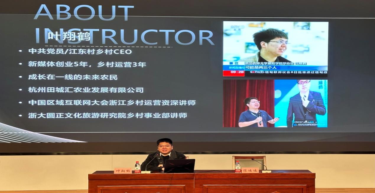 叶翔鹤校友,杭州市钱塘区河庄街道江东村乡村CEO。本场讲座中,他以“乡村里的创业青年”为题讲述了通过乡村运营通用的六大能力进行乡村运营服务的经历。他将乡村与宣传设计、文旅设计、数字化和自媒体相联系,通过乡村文旅、乡村电商、乡村运营等实操案让同学们更好地了解乡村创业。他用自己的经历告诉同学们要通过大量的学科竞赛、课程实践等提升自己的专业能力和工作能力,为未来就业打下坚实基础。同时也给同学们提供了一些启迪,使同学们对创业有了新的思考。最后他以“各美其美,美美与共”来结尾,祝愿每位同学都有美好的未来。