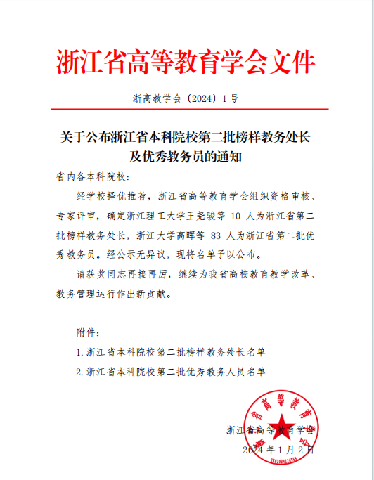 近日,浙江省高等教育学会发布了《关于公布浙江省本科院校第二批榜样教务处长及优秀教务员的通知 》(浙高教学会〔2024〕1号 ),学院教师周洁被评为第二批优秀教务人员。