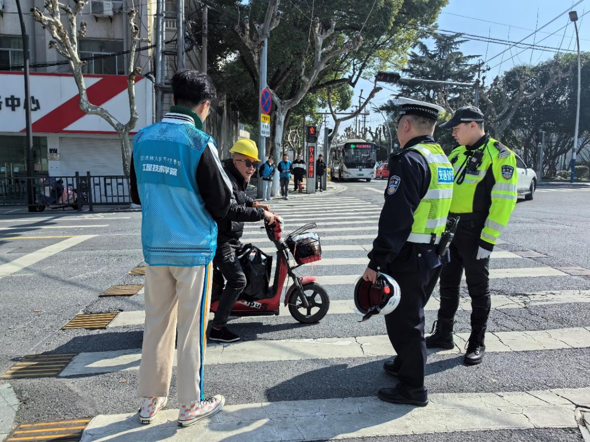 “叔叔,请您带上头盔!”在诸暨市公安局交通警察大队三思桥交警的带领下,师生党员化身交通指挥员,身穿蓝马甲,走上街头开展文明劝导行动,在人行横道上引导行人、非机动车有序通行等。