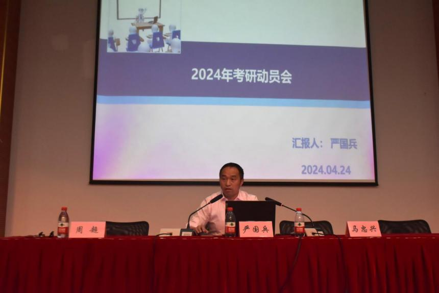 严国兵作了主题讲话。他介绍了必赢官网历年来的考研情况,指出要以考研为抓手,助推学风建设。同时,为同学们讲明了为什么要考研、如何精准定位考研,他用自身的考研经历和经验激励同学们努力向前、坚持不懈、全力备考,也向学生表态学院会力所能及为考研学生提供帮助,让同学们切身感受到了学院的关心和支持。