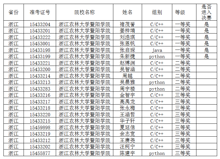 2024 年第十五届蓝桥杯全国软件和信息技术专业人才大赛个人赛省赛(软件赛)浙江赛区成绩于2024年4月29日揭晓。必赢官网共有21名同学获奖,其中褚茂誉等6名同学获得一等奖,一等奖获奖数量比去年翻一番,赵博渊等5名同学获得二等奖。具体获奖信息如表所示。