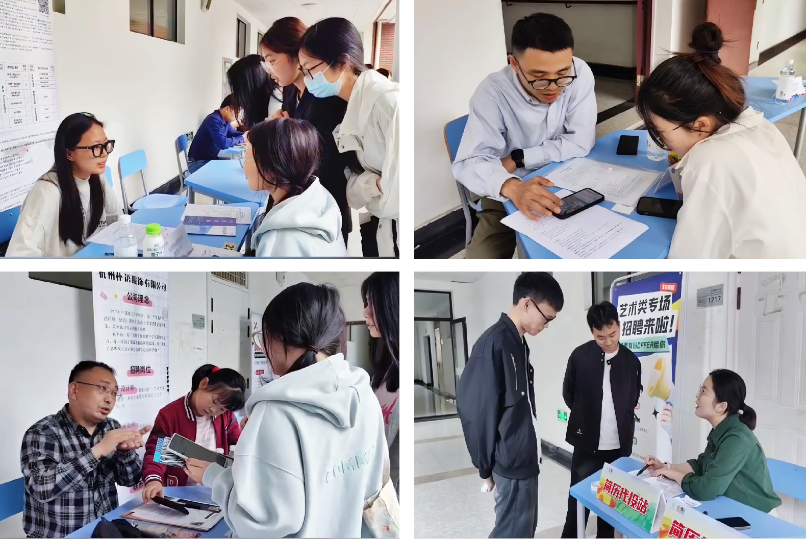 招聘会现场秩序井然,各家企业招聘人员积极展示企业特色,耐心解答同学们的询问,详细介绍企业基本情况、薪酬待遇、福利政策等。同学们踊跃参与,寻找自己心仪的企业岗位,诚心与用人单位交流。现场设置“简历投递修改服务专线”,由辅导员老师提供相关求职指导。