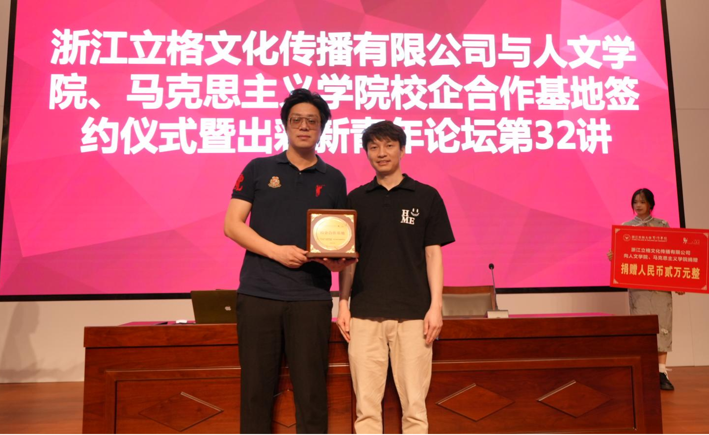 活动伊始,宣王威为企业代表授牌,共建校企合作基地,并特别感谢浙江立格文化传播有限公司的两万元捐赠。