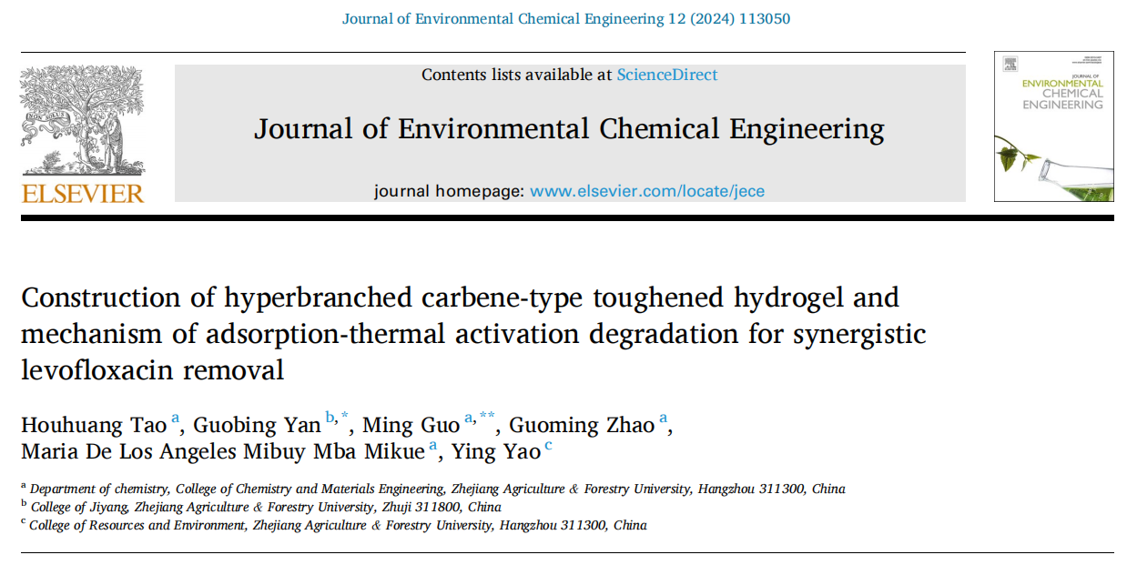 近日,生物环境学院教授严国兵与浙江农林大学教授郭明,合作在国际著名期刊《Journal Of Environmental Chemical Engineering》上发表了题为《Construction of hyperbranched carbene-type toughened hydrogel and mechanism of adsorption-thermal activation degradation for synergistic levofloxacin removal》的学术论文。