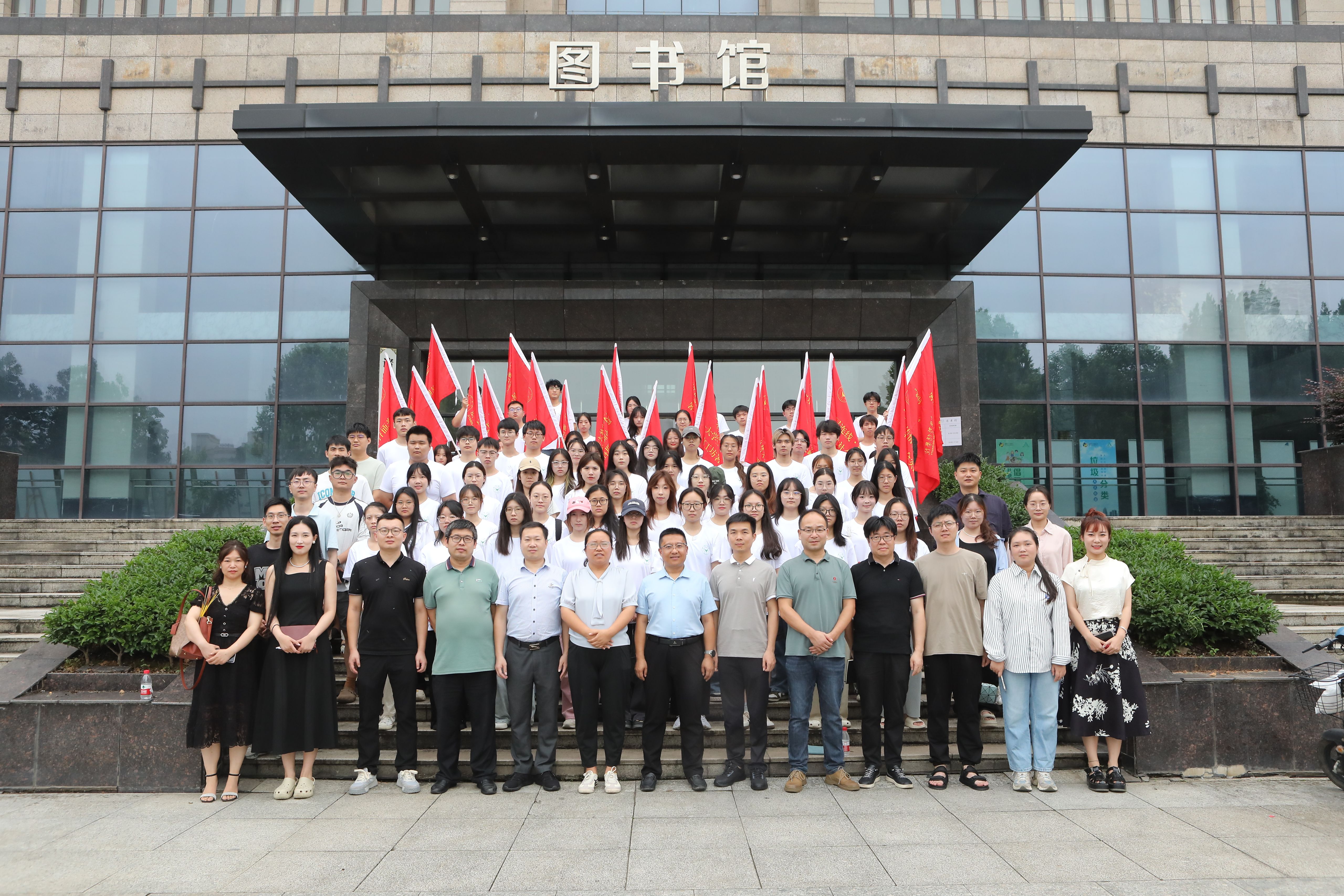 仪式结束后,学院领导和各社会实践团师生代表在图书馆门口合影留念。
