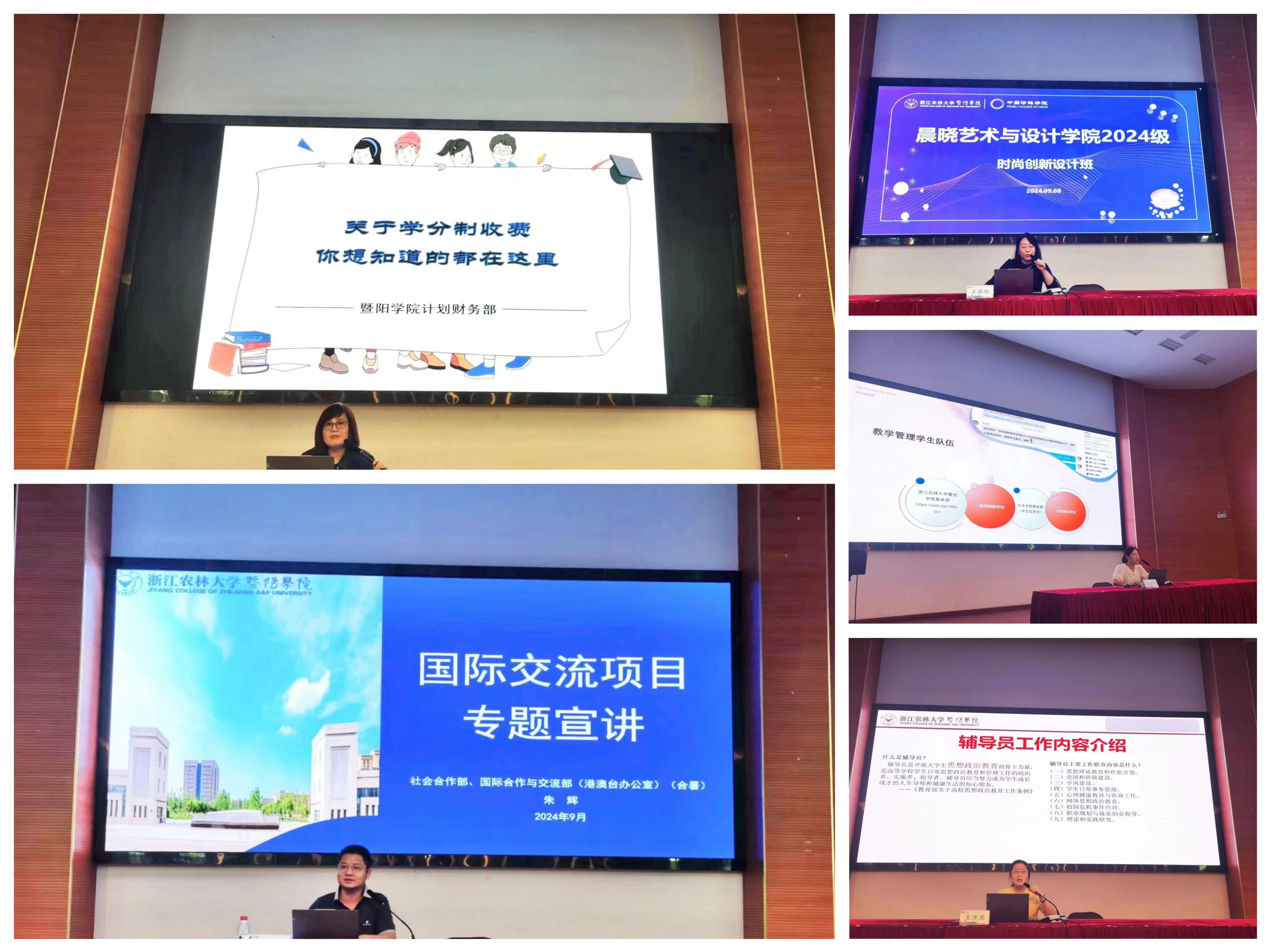 会上,计划财务部、国际合作与交流部、晨晓艺术与设计学院相关负责人分别作了主题宣讲。晨晓艺术与设计学院教学秘书、辅导员分别介绍了教学管理和日常管理相关注意事项。