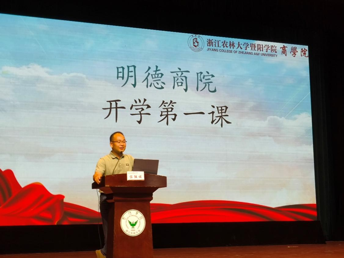 商学院党总支书记张佩成为全体新生讲授“开学第一课”。他引用梅贻琦先生名言“所谓大学者。非谓大楼之谓也,有大师之谓也”,引发全体新生对于如何顺利成为新时代大学生的思考,他希望全体新生尽快调整心态,适应环境,制定学习计划,规划未来人生,利用短暂的大学学习努力培养自身综合素质和能力。同时,他就安全稳定和军训工作进行了具体布置,并提出明确要求。