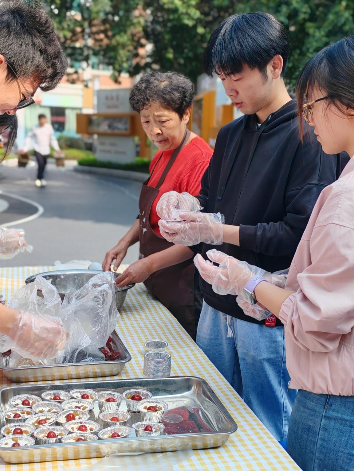 活动当天,学生党员们提前到达现场布置,营造“围炉煮茶”的节日氛围,社区老人们围坐在一起,欢声笑语,共度佳节。活动中,学生党员们在社区工作人员的指导下,还手工制作了“重阳糕”,揉面、包馅、捏造型,体验传统糕点制作乐趣的同时,将这份甜蜜的祝福也包进了糕点里,送给社区的每一位老人,让他们感受来自年轻人的关心与关爱。