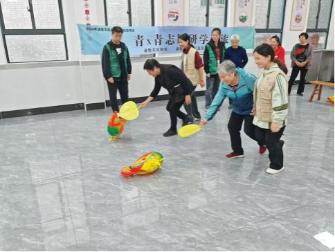 活动伊始,志愿们带领老少跳手势舞蹈《上春山》《大花轿》,开起暖场活动。接着开展“羽书飞鸿”“冰壶挑战”“赶鸡进笼”“夸夸咱村”系列小游戏。老少两代在游戏中结对合作,共同完成任务,笑容灿烂而温暖。