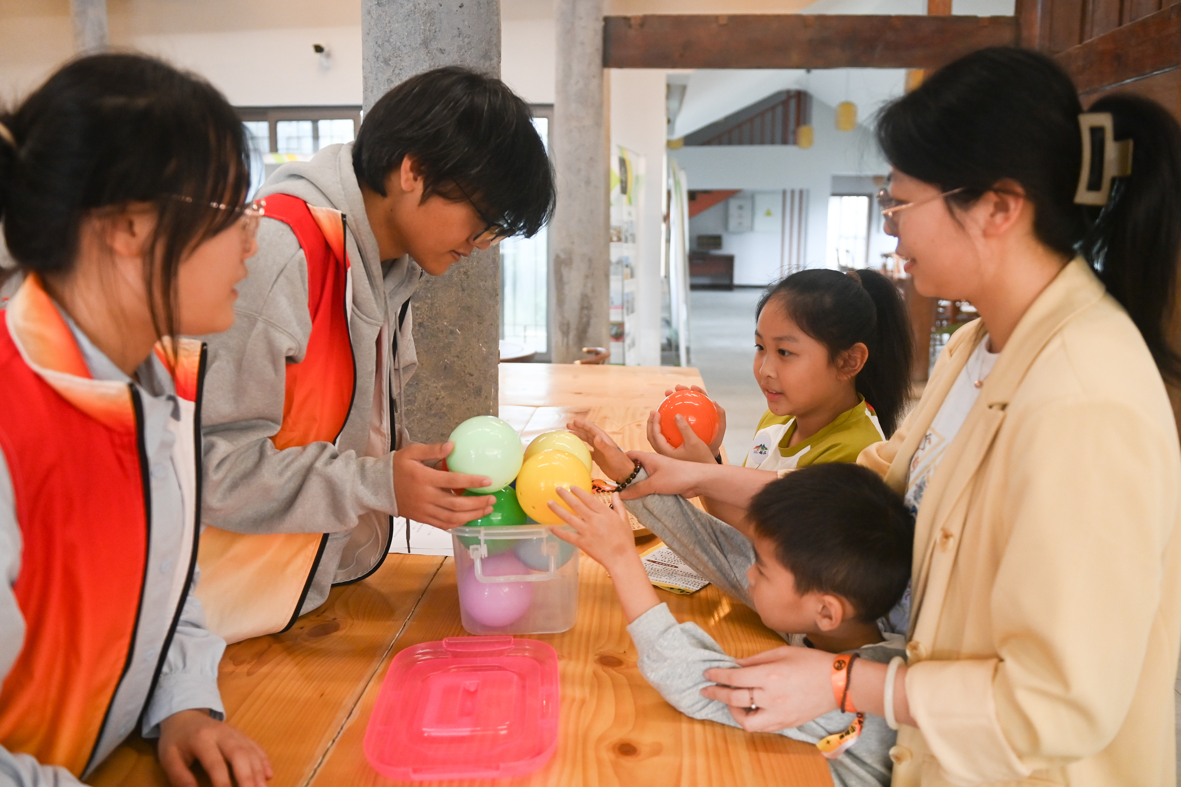 活动当天,志愿者们热情地参与到各个环节。在游园会的自由体验阶段,志愿者们积极协助亲子家庭参与美食体验、亲子时光速写、漆扇妙趣、树叶贴画等丰富多样的项目。