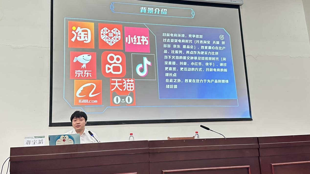 蒋宇韬分享了当前电商大环境的竞争情况,通过对比分析过往电商货架时代与当前图文种草及短视频时代,向同学们转达设计元素在运营过程中所表达的产品情绪价值对消费者购买决策的影响。他归纳梳理了市场当下各类产品的视觉设计方向,总结出目前产品设计应主打简约风格,需结合生活化的场景和视觉效果,利用对色彩心理学的应用与流行色彩趋势的把握来提升产品“黏性”。他鼓励广大产业班同学要重视各电商平台视觉效果特点,用电商主图作为设计样例,针对性叙述不同环境下主图应用时的设计要求元素,加强产品宣传效果。