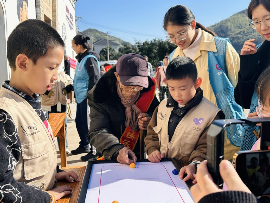 活动开始,志愿者们精心策划的游戏环节点燃了现场的氛围。在“蒙眼踏步”趣味游戏中,老人们戴上眼罩,在志愿者的耐心引导下,伴随着轻松愉快的音乐声,踏出欢快的步伐,现场充满了欢声笑语。在冰壶挑战环节,一位89岁高龄、拄着拐杖的老人展现了令人赞叹的技巧,他每一次精准投掷都赢得了志愿者们的热烈掌声。