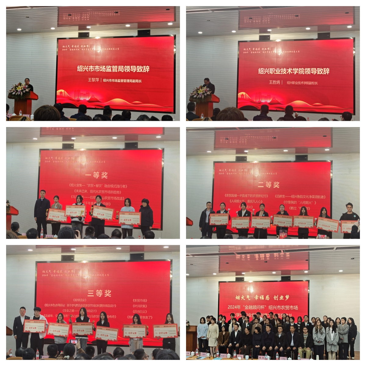 12月4日,2024年“金融顾问杯”绍兴市农贸市场大学生创新创业大赛在绍兴职业技术学院举行。绍兴市市场监管局、团市委、浙商银行绍兴分行、绍兴职业技术学院等单位领导参会,学院创新创业学院与部分创业团队师生应邀观摩大赛。