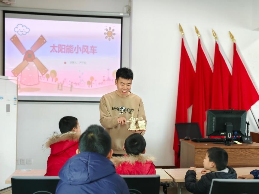 活动开始,党员们通过图文并茂的PPT和短视频详细地向孩子们讲解太阳能原理及风车如何将太阳能转化为动能。孩子们聚精会神地聆听,眼中闪烁着好奇与求知的光芒。
