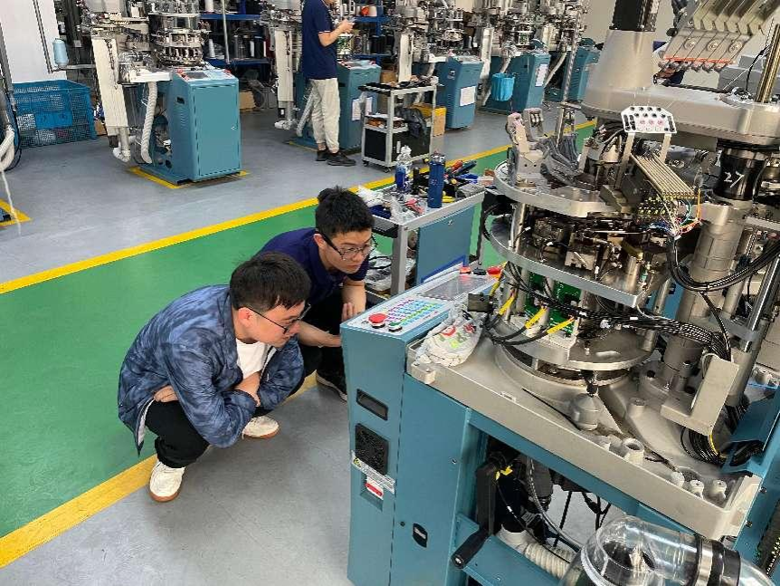 在交流过程中,学院双创团队详细介绍了团队目前主要研究方向和孵化情况,着重介绍了本项目团队在袜业企业成功实施的数字化云平台。该项目通过融合云计算平台、物联网技术、人工智能技术,搭建软硬件一体化体系,实现了生产、管理、财务、销售等职能部门之间的数据互联互通,有效助力企业实现了降本增效的经营目标。陈皇华则分享了浙江罗速在袜机领域的经营和研发现状,对项目团队在袜业产业领域机网联合方面的探索给予了高度评价,并表达了对提升设备智能化、自动化和远程管理能力的兴趣。双方就如何进一步提高袜机自控能力进行了深入讨论,并探讨了校企合作的可行性方案。