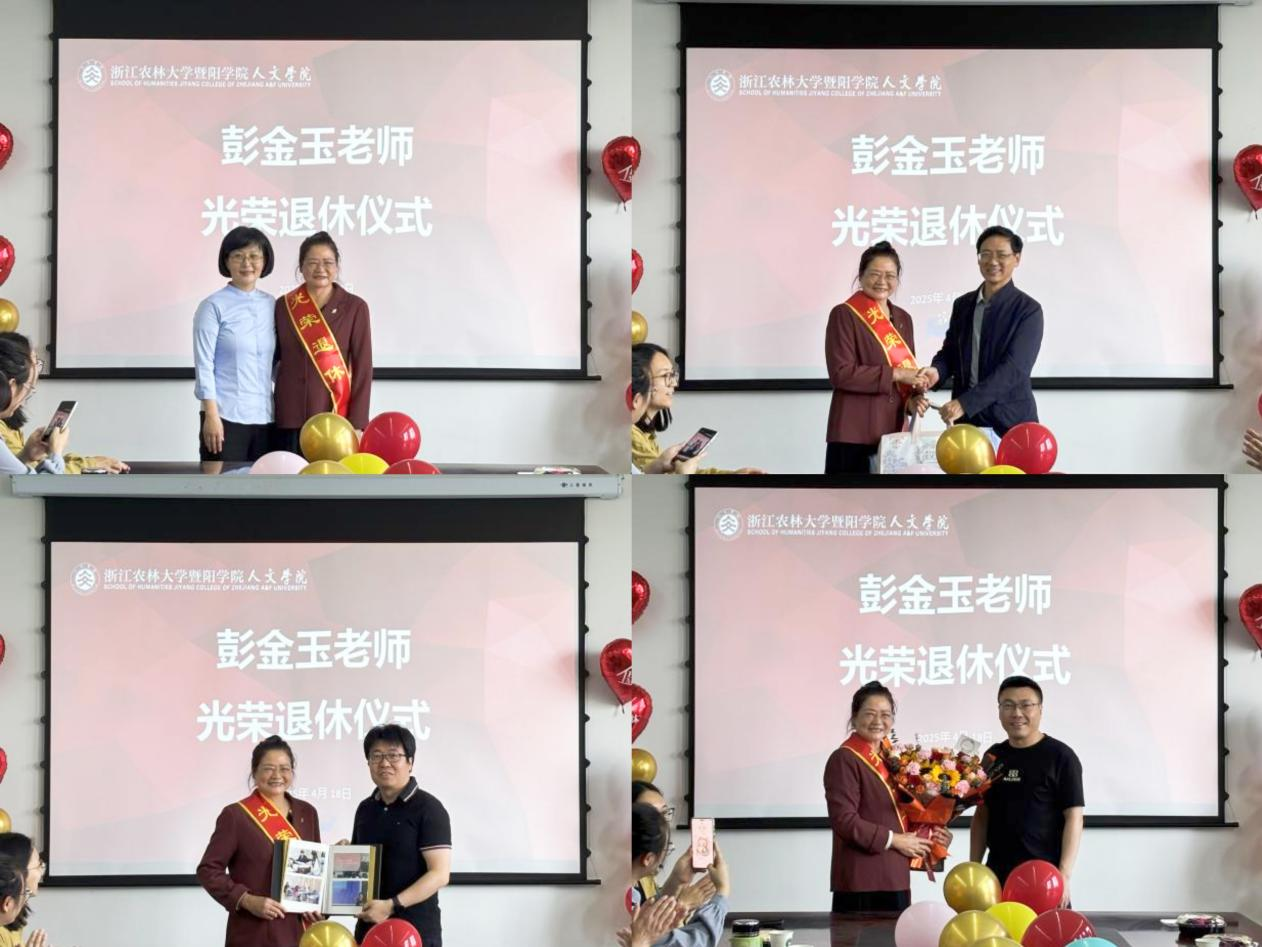 仪式上,在热烈的掌声中,李叔君为彭金玉颁发绶带,徐平荣送上荣退慰问品,人文学院副院长(主持工作)汪永奇送上纪念相册,马克思主义学院副院长献上鲜花。