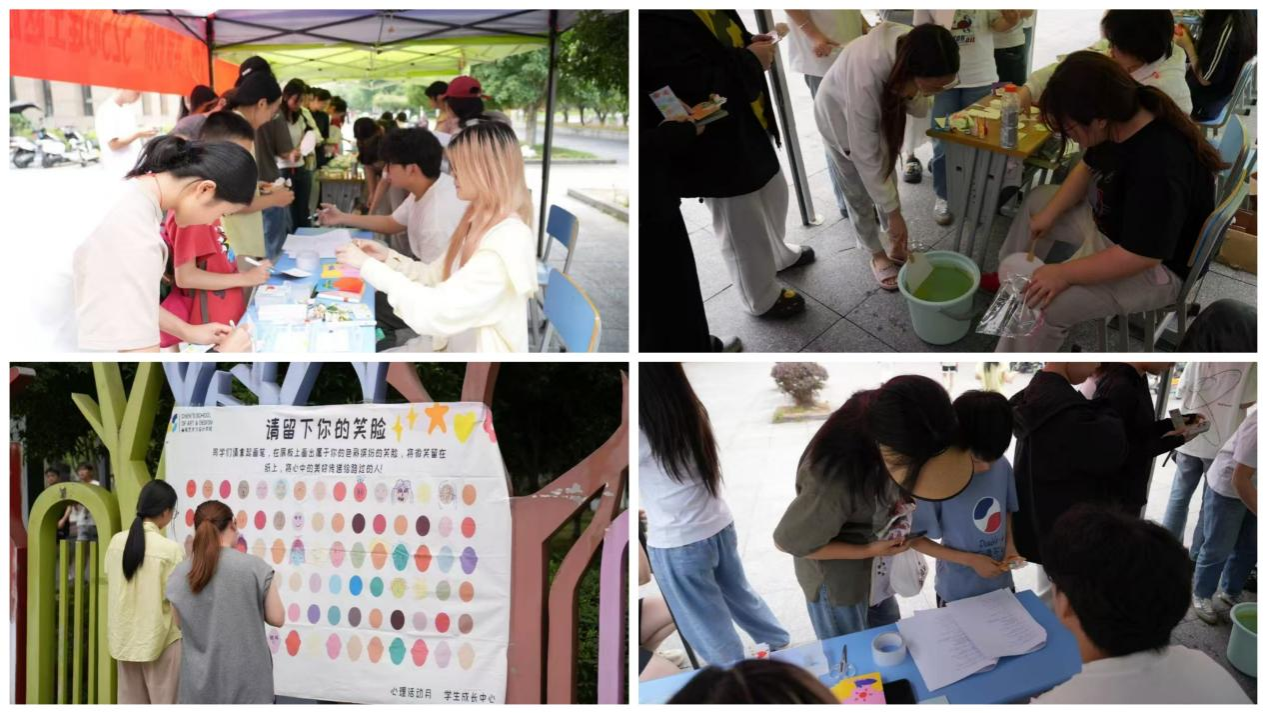 现场设立九大特色游戏区域,包括“故事换花”“画出你的笑脸”“手工漆扇书签制作”“心理知识问答”“击败负能量”“涂个开心,石膏娃娃绘图”“情绪漂流瓶制作”“请与我击掌”以及“抽取盲盒换礼品”。同学们在这些摊位上通过书写明信片、绘画、艺术创作、趣味答题、运动、色彩涂抹、纸条封存、击掌互动以及盲盒抽奖等活动,不仅学会了心理调适方法,增长了心理健康知识,还在创作中宣泄情绪,打破了社交隔阂,寄托美好期许。
