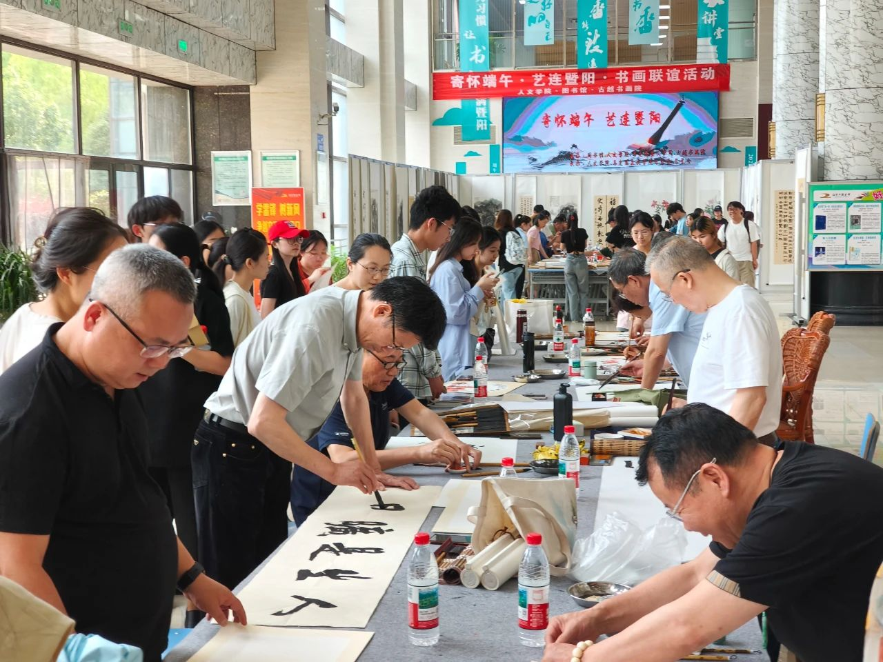 5月27日下午,由必赢766net手机版图书馆、人文学院、马克思主义学院、古越书画院联合主办,人文学院、马克思主义学院分团委及学生会承办的“寄怀端午·艺连暨阳”书画进校园活动在图书馆一楼大厅举办。