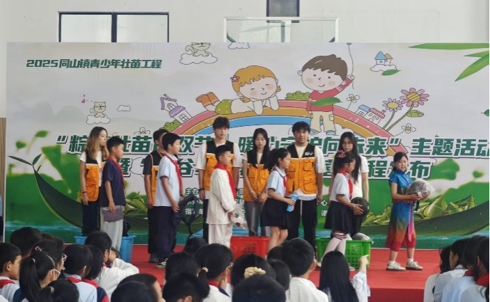 活动融合了“六一”国际儿童节与端午传统佳节,通过系列文化体验、互动实践活动,进一步推动2025年同山镇青少年壮苗工程实施。在文艺汇演环节,人文学院、马克思主义学院学生代表带来了精彩朗诵《陪伴的永恒交响》,学生代表化身“圆梦使者”为同山镇中心学校的学生点亮微心愿。