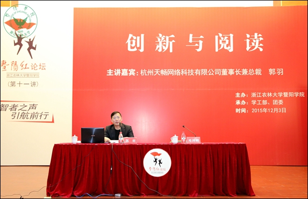 本次报告会,突出“创业分享”的内容主题,邀请浙江省侨联常委,杭州市政协委员,著名大学生创业导师,杭州天畅网络科技有限公司董事长兼总裁郭羽先生担任主讲嘉宾。