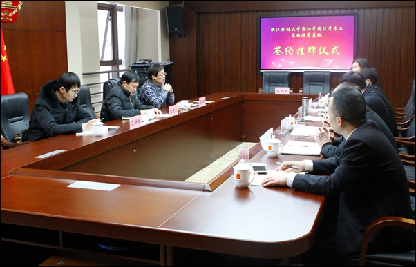 学院副院长张晓优为诸暨市人民法院授牌,并同诸暨市人民法院院长施华南、副院长王忠达、副院长张学军、副院长陈勇等共同为基地续约挂牌。