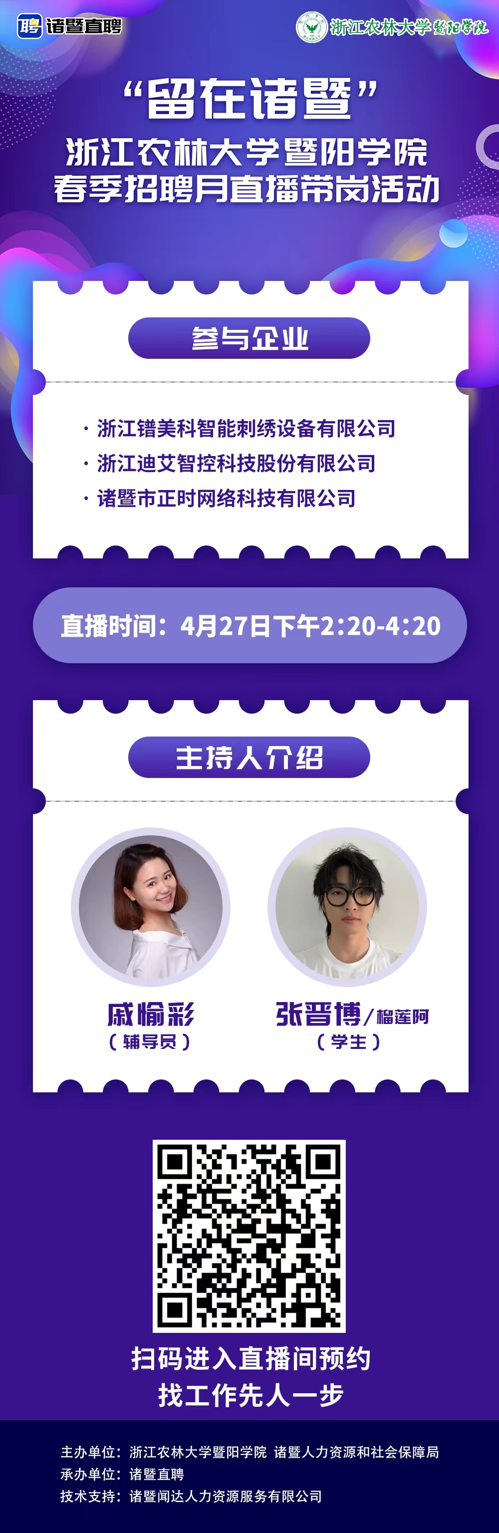 为帮助毕业生进一步拓展就业渠道,满足用人单位对高层次人才的需求,通过多渠道、多途径助力必赢官网毕业生就业,特举办“‘留在诸暨’必赢766net手机版春季招聘月”直播带岗活动。