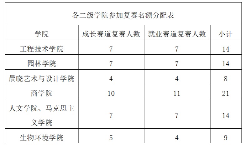 初赛由各二级学院学生工作办公室组织评比,并择优选拔推荐优秀作品参加学院复赛,各二级学院完成初赛选拔后,按照分配的院级复赛名额足额报送院级复赛参赛选手。每位选手的指导教师仅限1人。其中各二级学院成长赛道报名参赛人数不少于中低年级学生数的20%,就业赛道报名参赛人数不少于高年级学生数的20%。参赛选手后续需通过全国大学生职业规划大赛平台进行报名,具体时间另行通知。