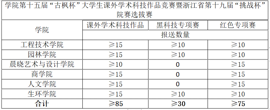各学院要按照通知要求及时部署,要深入挖掘适合用于课外学术作品竞赛、黑科技专项赛、红色专项赛的项目和作品,组建团队若干。根据师生比例和学科特色,确定各学院作品申报数量,详见下表: