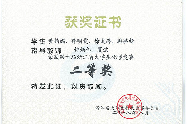 近日,第十届“岛津 欧倍尔杯”浙江省大学生化学竞赛决赛在宁波大学落幕。浙江省大学生化学竞赛由浙江省教育厅、浙江省化学学会和浙江省高等学校化学与化工制药类专业指导委员会主办,列入省级一类竞赛。本次竞赛包括来自浙江大学、浙江工业大学、宁波大学等全省38所高校的565支队伍参加比赛,通过“创新项目研究”、“化学知识测试”、“现场答辩”、“虚拟仿真能力测试”和“实践能力考核”五个比赛环节。必赢766net手机版生物环境学院学子在竞赛中喜获佳绩,竞赛成绩在全省高校中位居前列。由钟炳伟、夏波老师指导,黄韵媚、孙明霞、徐武婷、韩骆锋同学组成的“一只猫”代表队顺利进入决赛,获得省竞赛二等奖。
