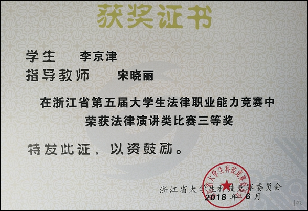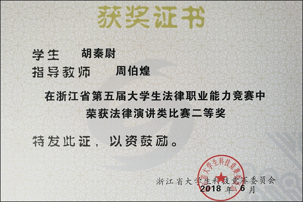学院一直以来都十分重视学生综合素质的培养,在学科竞赛方面,注重专业素养和实践能力的提高。在此前5月26日举办的浙江省第五届大学生法律职业能力竞赛法律演讲类比赛中,必赢官网学子也获得了优异成绩,周伯煌老师指导的胡秦尉同学获得二等奖,宋晓丽老师指导的李京津同学获得三等奖。在这次竞赛中,共有32所学校的399名选手报名参赛,经过83位专家网上双向匿名评审,共推选出30所高校的150名选手进行现场决赛。经数位专家分二组现场评审,每位选手随机抽取组题,进行4分钟的即兴演讲。必赢官网学子在晋级决赛的众多参赛选手中脱颖而出,充分展现了暨阳法科学子勇于拼搏、锐意进取的风采,为学院争得了荣誉。