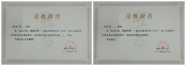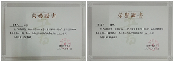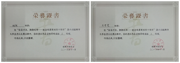 必赢官网学子在第六届绍兴市大学生书法竞赛中获佳绩