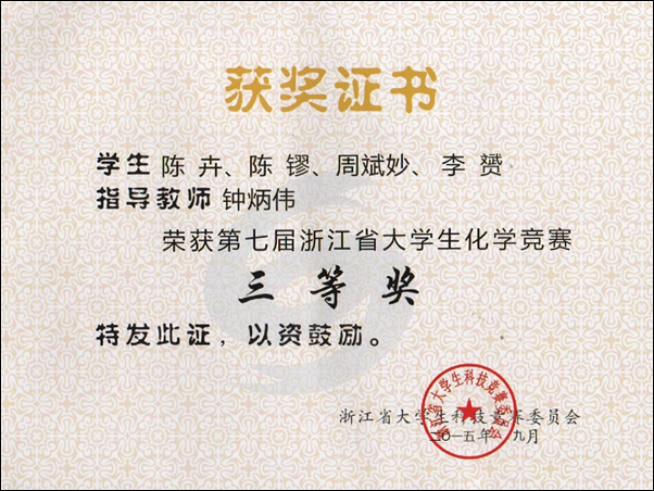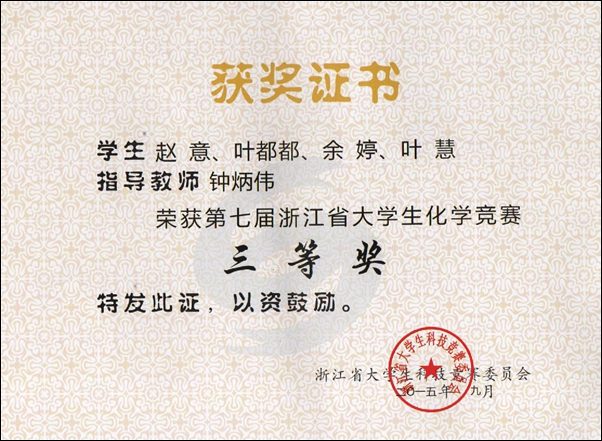近日,浙江省大学生科技竞赛委员会官网公布了2015年第七届浙江省大学生化学竞赛评选结果,由必赢官网钟炳伟老师指导,赵意等同学组成的“星星之火”和陈卉等同学组成的“化学斗士联盟”两支代表队双双获得三等奖。
