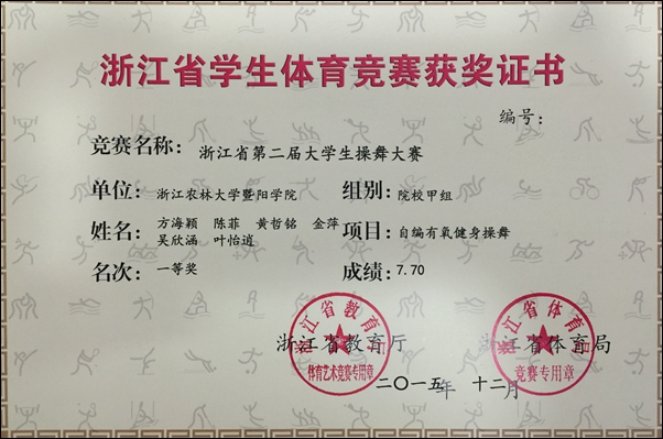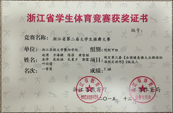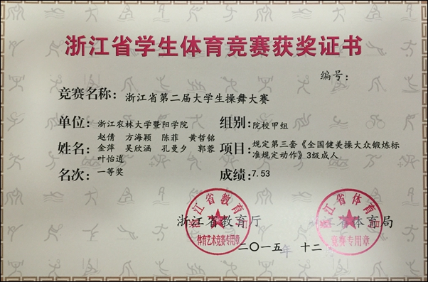 本次比赛是由浙江省教育厅、体育局主办,中国美术学院、浙江国美青少年体育俱乐部承办的2015年全国全民健身操舞大赛(浙江分站赛)。此次参赛到了学院、体育军训部和相关部门的重视和支持,体育军训部带队老师江翠萍对参赛队员做了认真的挑选和悉心的培训与指导,对健美操做了精心的编排。队员们充分利用课余时间,刻苦训练,在比赛中勇于拼搏,齐心协力,共创佳绩,为学院争得了荣誉,也为扩大学院影响、提高学院知名度做出了积极贡献。