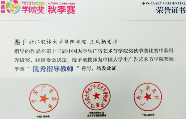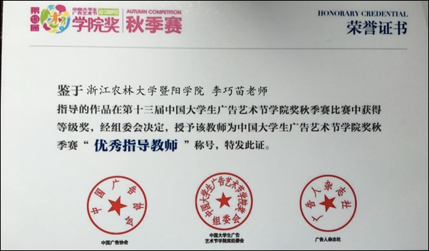 近日,第十三届大学生广告艺术节学院奖秋季赛落下帷幕。本届大赛于2015年7月正式启动,共有来自全国各地高校学生的9万多件作品参加比赛。必赢官网人文系广告学专业董铮等同学的参赛作品共获得优秀奖5项、佳作奖11项的佳绩。同时,王凤栖、李巧苗两位老师获得“优秀指导教师”称号。