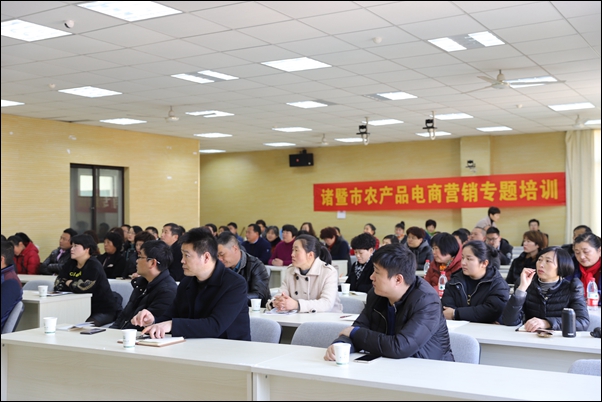 2017年12月25日-26日,诸暨市农产品电商营销专题培训在陶朱商学院举行。诸暨市农林局副局长郑伟林、信息中心主任徐铁平及陶朱商学院相关人员出席开班仪式,来自诸暨各乡镇街道村淘4S店的站长和从事电商事业的有关人员参加培训。