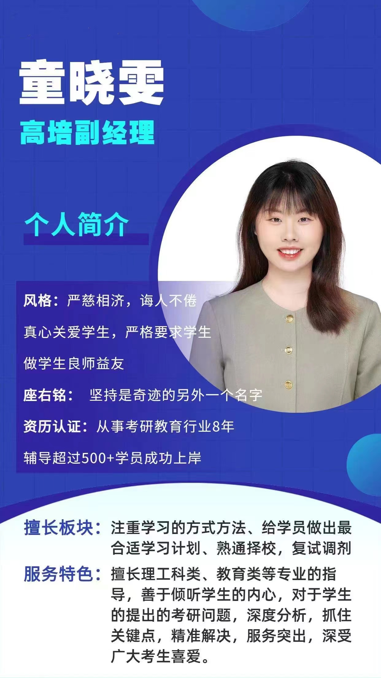 介绍:擅长注重学习的方式方法、给学员做出最适合的学习计划,熟通择校安排、复试调剂等环节
