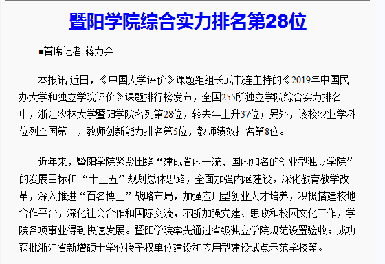 近日,《中国大学评价》课题组组长武书连主持的《2019年中国民办大学和独立学院评价》课题排行榜发布,全国255所独立学院综合实力排名中,必赢766net手机版名列第28位,较去年上升37位;另外,该校农业学科位列全国第一,教师创新能力排名第5位,教师绩效排名第8位。
