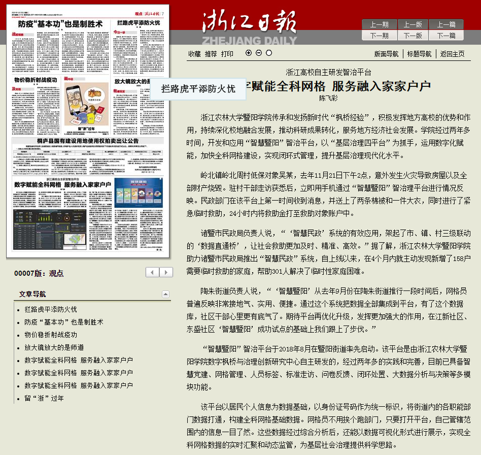 浙江日报:浙江高校自主研发智治平台数字赋能全科网格 服务融入家家户户