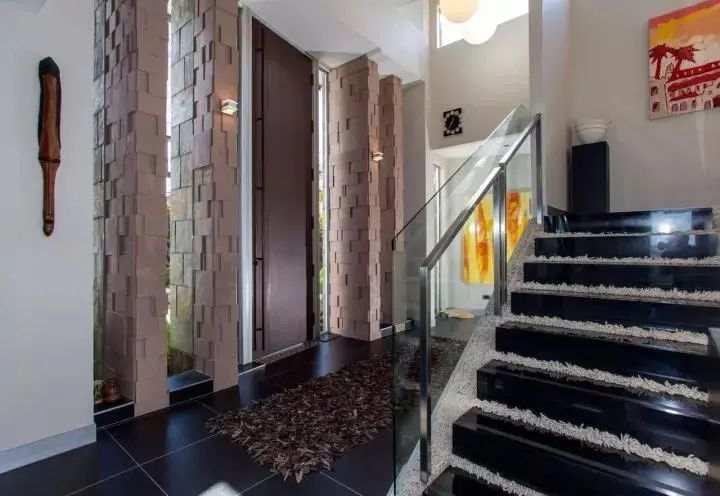 沿着石板路的进口,高达3.6米当代设计全铜大门迎面而来,通透的玻璃厅堂及廊柱,巧夺视角的之字型楼梯,用整块大理石打磨的楼梯踏步环绕着超长羊毛地毯,近似组合式的装置艺术,软的和硬的对比,实的和透的结合,通透灵空尽收眼底,结合了东方绘画“疏可跑马,密不透风”审美趣味。