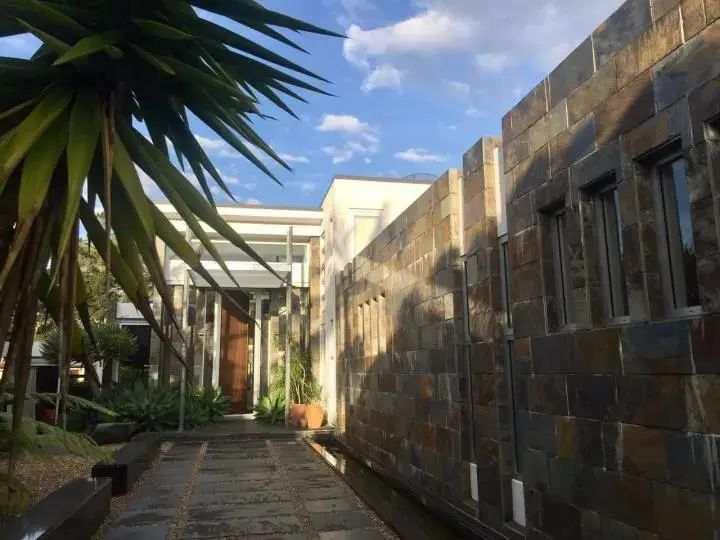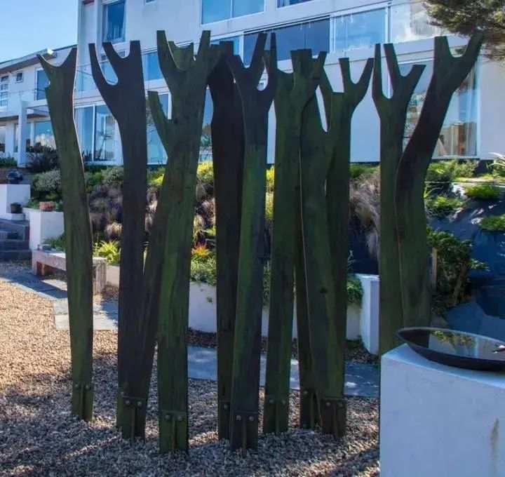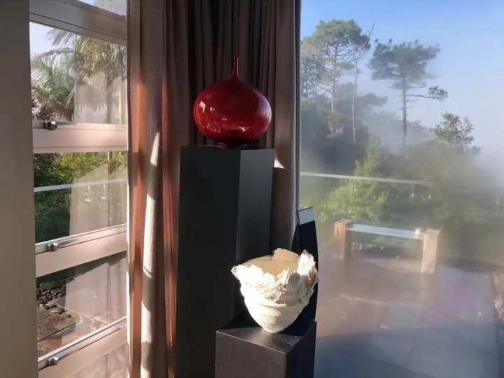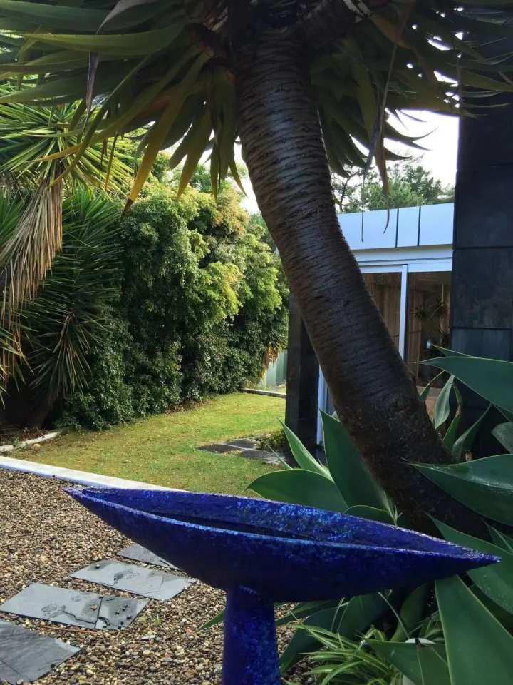 如果说中国私家庭院常见于盆景式景观的精雕细琢,那么晨晓的院落则是朴拙自然,物尽其用地充分利用于周边的自然景观,自然保护区内近百种参天大树与奇花异草俨然变成了晨晓的天然花园。庭院五彩砾石之上拼接着几何形状的石板小路,蜿蜒曲径地通向住宅的幽静、私密之处。特别是护院式的20米长金鱼池,碧波荡漾延伸到远处的海湾,更是使人叫绝。种种天然之趣绝非艺术家庭院的最大特色,不经意“散落”其间的当代雕塑和装置艺术作品犹如神来之笔,才是整个院落景致画龙点晴的绝妙之处。